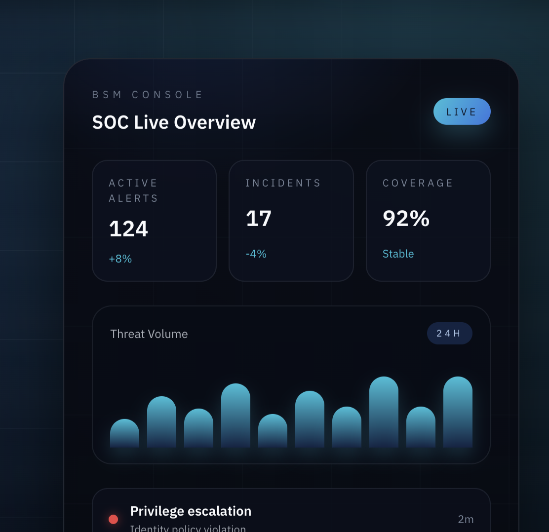BSM centralises telemetry, detection rules, and response playbooks into a modular stack that scales from pilot to enterprise-grade SOC operations.